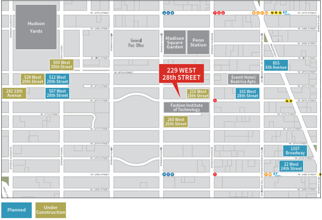 • The Property sets itself apart from nearly all of its competition by providing four sides of open light and air. Neighboring buildings are extremely modest, with a two-story structure to the east and an open parking lot to the west. The Fashion Institute of Technology occupies the entire block front across 28th Street, with a series of significantly set back 8-story buildings protecting the Property’s south-facing light, air and views.